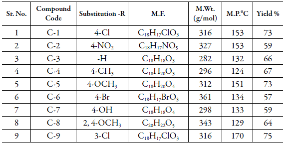 Similarly, other compounds were synthesized. Table 1 shows the different substitutions and physical parameters of all the synthesized compounds. These chalcone compounds are used for physicochemical studies after crystallization.