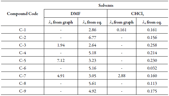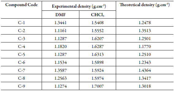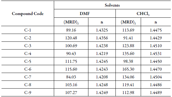 Refractive index:Table 4 shows the experimental values of densities and refractive index of solutions of all the ten synthesized compounds in DMF and chloroform at 303.15 K.
