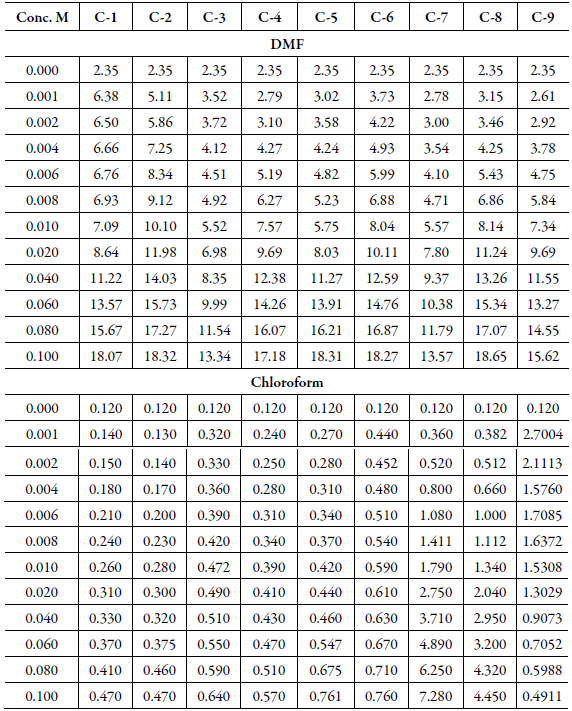 Table 7: The conductance* (mmho) of chalcones in DMF and chloroform at 303.15 K.