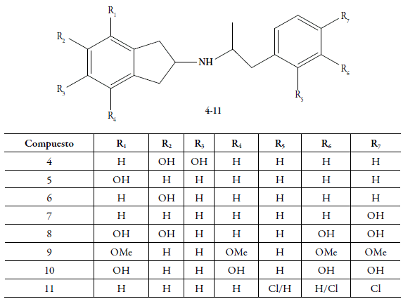En publicaciones anteriores hemos reportado la síntesis, la evaluación farmacológica y el estudio teórico computacional de los análogos mono y dihidroxilados (sobre el anillo indano) del N-aralquil-2-aminoindano 4-8. Estas sustituciones se realizaron sobre ambos anillos bencénicos y, en especial, se observó que la incorporación al menos de un grupo OH sobre el fragmento aralquil, modificaba la actividad dopaminérgica central desde las respuestas agonísticas hacia las antagónicas, es decir, se obtenían compuestos que ejercían su actividad como antagonistas [10-14]. Asimismo, se encontraron actividades similares en los análogos 4,7-dimetoxi-2-aminoindano-N-aralquil, bajo sus formas metoxiladas sobre el anillo bencénico del fragmento aralquil 9 y el derivado fenólico 10, respectivamente [15]. Por otro lado, cuando se incorporan los átomos de cloro sobre el anillo bencénico del N-aralquil, en los derivados del 2-aminoindano 11 se consiguieron actividades agonísticas (figura 2) [16].