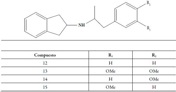 En el presente trabajo se sintetizaron los clorhidratos del 2-aminoindano-N-[2-(mono o dimetoxi)-fenil)-1-metil-etil] 12-15 y su evaluación farmacológica mostró una respuesta agonística a través de mecanismos dopaminérgicos centrales. Esta investigación es un importante aporte para el desarrollo de nuevos fármacos, capaces de restablecer la homeostasis de la transmisión dopaminérgica en las enfermedades de Parkinson o Huntington (figura 3).