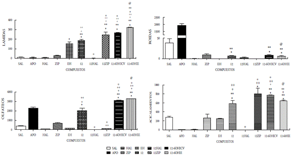 Figura 5: Efecto del compuesto 12 a la dosis de 50mg/5ml sobre la conducta esteriotipada en ratas. En las ordenadas, la sumatoria de las conductas medidas. En las abscisas, los compuestos probados. Las observaciones se realizaron por 1 hora. Los resultados se expresaron como promedio±eep de cuatro mediciones independientes. Los datos fueron analizados mediante el análisis de varianza (ANOVA) de una vía y la prueba de Newman Keuls. * diferencia significativa (ds) vs sal; ** ds vs apomorfina (APO); + ds vs haloperidol (HAL); ++ ds vs ziprasidona (ZIP); º ds vs 12; ºº ds vs 12-60HICV; @ ds vs Enfermedad de Huntington (EH). p<0,001.