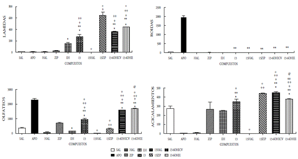 Figura 6: Efecto del compuesto 13 a la dosis de 50mg/5ml sobre la conducta esteriotipada en ratas. En las ordenadas, la sumatoria de las conductas medidas. En las abscisas, los compuestos probados. Las observaciones se realizaron por 1 hora. Los resultados se expresaron como promedio±eep de cuatro mediciones independientes. Los datos fueron analizados mediante el análisis de varianza (ANOVA) de una vía y la prueba de Newman Keuls. * diferencia significativa (ds) vs sal; ** ds vs apomorfina (APO); + ds vs haloperidol (HAL); ++ ds vs ziprasidona (ZIP); º ds vs 13; ºº ds vs 13 -6OHICV; @ ds vs Enfermedad de Huntington (EH). p<0,001.