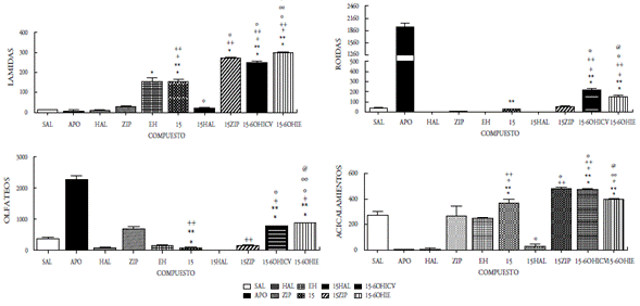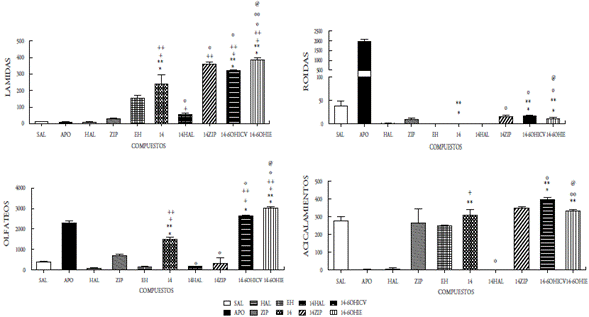 Figura 7: Efecto del compuesto 14 a la dosis de 50mg/5ml sobre la conducta esteriotipada en ratas. En las ordenadas, la sumatoria de las conductas medidas. En las abscisas, los compuestos probados . Las observaciones se realizaron por 1 hora. Los resultados se expresaron como promedio±eep de cuatro mediciones independientes. Los datos fueron analizados mediante el análisis de varianza (ANOVA) de una vía y la prueba de Newman Keuls. * diferencia significativa (ds) vs sal; ** ds vs apomorfina (APO); + ds vs haloperidol (HAL); ++ ds vs ziprazidona (ZIP); º ds vs 14; ººds vs 14-6OHICV; @ ds vs Enfermedad de Huntington (EH). p<0,001.