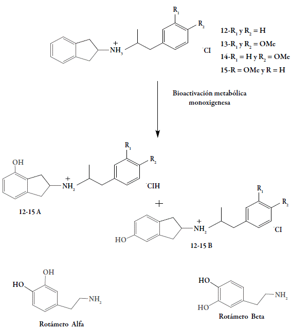 De acuerdo con los resultados farmacológicos, los compuestos estudiados se comportan como profármacos, ya que una vez administrados se requiere un tiempo de espera para iniciar la evaluación. Durante ese lapso, las formas inactivas de los compuestos 12-15 dentro del organismo o sistema biológico, sufren una reacción metabólica (enzimática) capaz de incorporar el grupo OH (fenólico) en las posiciones 4 (análogo del rotámero alfa) 12-15 A y 6 (análogo del rotámero beta) 12-15 B del anillo indano, formándose así dos posibles metabolitos activos que contienen el farmacóforo total dopaminérgico (fragmento m-hidroxifeniletilamino). Los resultados experimentales confirman su acción agonista a través de mecanismos dopaminérgicos postsinápticos, con previa bioactivación metabólica que estaría en concordancia con nuestros resultados ya reportados (figura 8) [11-14,16]. De hecho, la incorporación del fragmento farmacofórico "m-hidroxifeniletilamino" en el núcleo indano, permite que interactúe en el receptor postsináptico, tal y como lo demuestra el aumento significativo en las cuatro conductas estereotipadas en las ratas desnervadas con 6-OHDA.