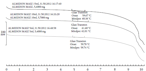 El rango de temperatura de gelatinización fue determinado por calorimetría diferencial de barrido (DSC- Mettler Toledo 822e, Suiza), previamente calibrado con indio, empleando el método propuesto por Mirmoghtadaie et al. [8], con algunas modificaciones. Se pesaron aproximadamente 2,2 mg de muestra en un crisol de aluminio, se adicionaron 7,5 μL de agua, se selló herméticamente y se dejó equilibrar por espacio de 30 minutos antes de hacer el análisis. Transcurrido el tiempo de humectación, la muestra se sometió a un programa de calentamiento en un rango de temperatura de 10 °C a 120 °C, a una velocidad de calentamiento de 10 °C min-1.