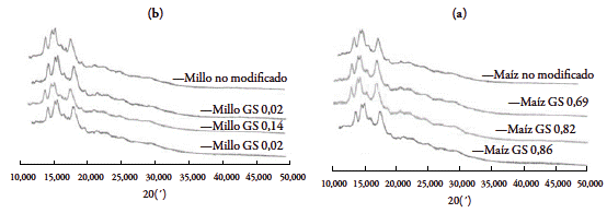 Los difractogramas muestran que la reacción de acetilación aparentemente produce daños pequeños en la estructura cristalina de los almidones modificados de millo; resultados similares se encontraron para las muestras de almidón de maíz acetilado [25,26].