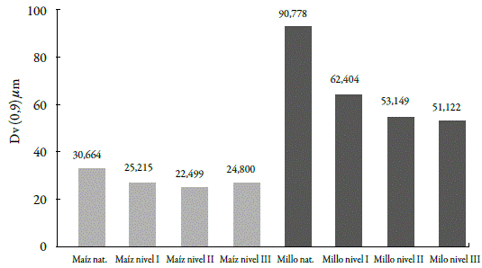 Figura 11: Tamaño de partícula de los almidones de maíz y millo en función del grado de sustitución. Nat: nativo; Nivel I: grado de sustitución 1; Nivel II: grado de sustitución II; Nivel III: grado de sustitución III.