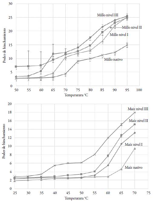 Figura 2: Poder de hinchamiento para los almidones de millo (nativo y modificados), a la izquierda, y maíz (nativo y modificados) como referencia, a la derecha.