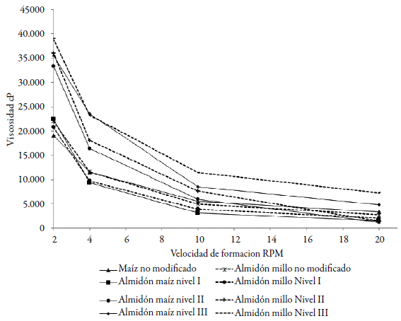 Los perfiles comparativos de la viscosidad aparente en función de la velocidad de corte (figura 3), para los almidones nativos y modificados de millo y de maíz, ilustran una disminución de la misma en función del aumento de la velocidad de corte para todas las muestras, demostrando un comportamiento pseudoplástico. Los valores más altos de viscosidad, se dan para las dispersiones del almidón de millo, siendo más altos en la medida que aumenta el GS. Es así como el almidón modificado de millo nivel III, mostró los valores más altos de viscosidad, 40.000 cP, valor superior a lo encontrado para los almidones acetilados de maíz y a los no modificados de maíz, con valores cercanos a los 20.000 cP.