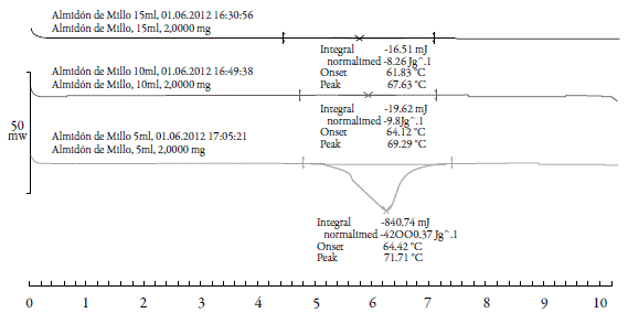 El rango de temperatura de gelatinización fue determinado por calorimetría diferencial de barrido (DSC- Mettler Toledo 822e, Suiza), previamente calibrado con indio, empleando el método propuesto por Mirmoghtadaie et al. [8], con algunas modificaciones. Se pesaron aproximadamente 2,2 mg de muestra en un crisol de aluminio, se adicionaron 7,5 μL de agua, se selló herméticamente y se dejó equilibrar por espacio de 30 minutos antes de hacer el análisis. Transcurrido el tiempo de humectación, la muestra se sometió a un programa de calentamiento en un rango de temperatura de 10 °C a 120 °C, a una velocidad de calentamiento de 10 °C min-1.