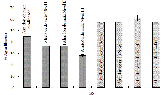 El porcentaje de agua liberada para las muestras de almidón en estudio (figura 6), como resultado del ensayo de estabilidad al congelamiento-descongelamiento se hace menor en los almidones de maíz modificados en comparación con los de millo, mostrándose más estables; mientras que para los almidones modificados de millo la acetilación solo mejoró ligeramente este comportamiento. Este aumento de la estabilidad es notorio para el almidón de maíz posiblemente atribuido al mayor GS alcanzado, disminuyendo el porcentaje de agua liberada del 44,7% para el almidón de maíz nativo hasta 27,94% para el almidón de maíz con el GS más alto. Para el almidón de millo, la reducción del agua liberada fue del 0,5%, comparando el almidón nativo con el de mayor GS.