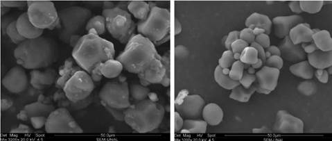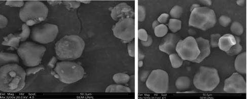 Figura 9: Microfotografías de los almidones de millo (izquierda) y de maíz (derecha) no modificados (3200X), por SEM.