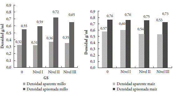 La densidad apisonada (figura 12) presentó un aumento respecto a la densidad aparente, para los dos almidones, pero la tendencia no fue muy clara al aumentar el GS. Los almidones de millo en estudio presentaron mayor voluminosidad aparente con valores entre 2,76 y 3,22, su voluminosidad apisonada se encontró entre 1,40 y 1,57; los almidones de maíz presentaron menor voluminosidad aparente (1,75-2,01) y voluminosidad apisonada entre 1,32 y 1,44.