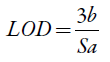 El límite de detección (ver ecuación 1) y el límite de cuantificación (ver ecuación 2) fueron calculados con base en la desviación estándar de los interceptos de las líneas de regresión (Sa) y de la pendiente (b) de la curva de calibración del método y sistema respectivamente.
