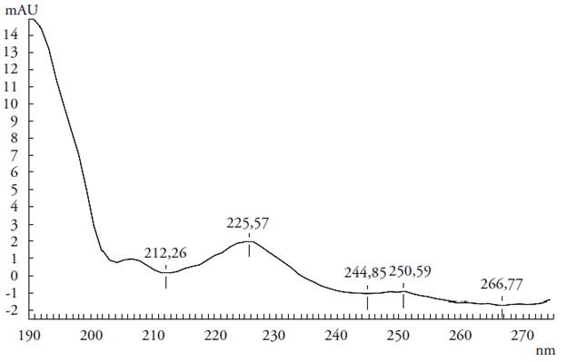 El ácido benzoico presentó un tiempo de retención de 3,84 +/- 0,02 min siendo apropiado para la realización de análisis rápidos y de bajo costo sin interferir con la señal de la matriz. Por medio del espectro de absorción molecular (ver figura 3) de una muestra del estándar del ácido benzoico a 6 μg/mL se determinó que la longitud de onda de máxima absorción (λ max) era de 226 nm, utilizándose este valor para la realización del análisis de las muestras.
