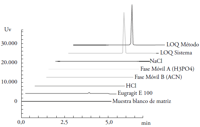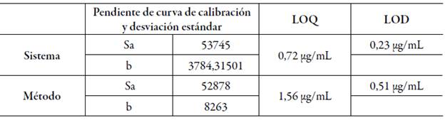 El límite de cuantificación (LOQ) fue de 0,72 y 1,56 μg/mL para el sistema y método respectivamente, el valor del límite de detección (LOD) para el sistema fue de 0,23 μg/mL y de 0,51 μg/mL para el método, por lo que todos los niveles de concentración de la curva de calibración del sistema y método pueden ser cuantificados con exactitud y precisión (ver tabla 7).