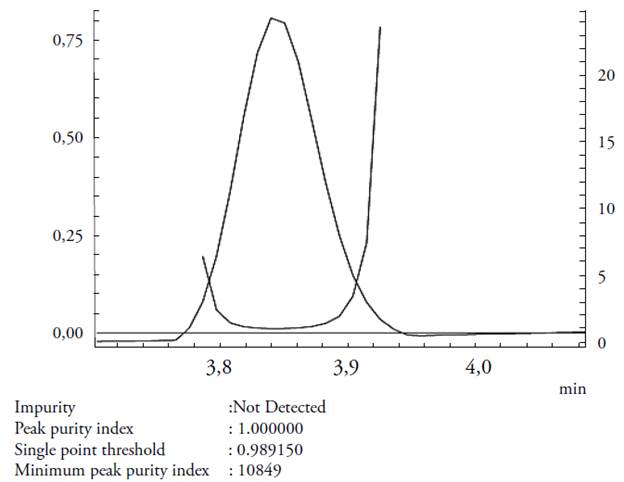 Por medio de la comparación de los tiempos de retención de los cromatogramas obtenidos de las muestras de los componentes de la fase móvil (ácido fosfórico al 1% y acetonitrilo), medio de almacenamiento para las orejas de cerdo (NaCl 1M), componentes de los complejos EuB 75 Cl 25 y EuB m (EudragitE® 100 y ácido clorhídrico 2,39 M) y de los blancos de matriz de piel porcina sin ácido benzoico, se determinó que no se presentaban interferentes en el tiempo de retención del ácido benzoico, puesto que no se identificó ninguna señal adicional como se observa en la figura 4. Adicionalmente, se verificó que ninguna de las muestras modificaba el EAM y la curva de similitud no se cruzara con la línea umbral, como es lo esperado. Esto indica que tras la comparación del espectro medio del pico con el resto de espectros, a medida que eluye el analito, no se presentan interferentes ya que la relación entre los mismos es 1 (índice de pureza de pico), como puede verse en la figura 5. Por lo tanto, la metodología analítica empleada garantiza la obtención de una señal inequívoca y específica del analito sin ningún interferente.