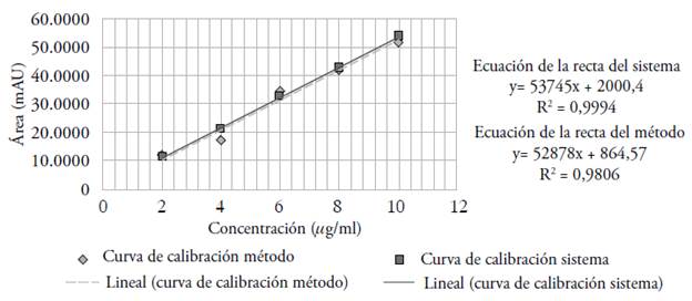 Partiendo de tres SM-AB se prepararon soluciones por triplicado de concentraciones: 2, 4, 6, 8, 10 μg/mL tanto para el sistema como para el método. El análisis respectivo de la pendiente e intercepto se realizó por medio del estadístico t de Student y la regresión fue evaluada a través del análisis de varianza (ANOVA). Como criterio de aceptación para el estadístico t asumiendo 13 grados de libertad (GL) se tuvo en cuenta un t crítico de 2,1604, y en el caso del ANOVA un F crítico de 4,667 con GL en el numerador de 1 y en el denominador de 13. Tanto para el estadístico t como para el ANOVA la probabilidad seleccionada fue del 95%.