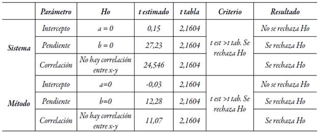 Para evaluar el intercepto, la pendiente y el coeficiente de correlación de las curvas de calibración del sistema y método se plantearon pruebas de hipótesis las cuales fueron analizadas por medio del estadístico t Student (ver tabla 2).