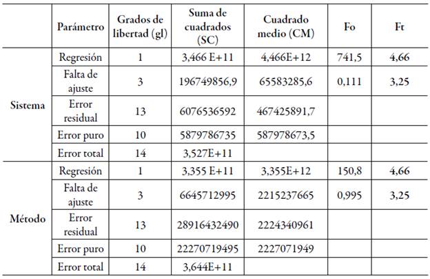Tabla 3: Análisis de varianza (ANOVA) y estadístico de Fisher para determinar la regresión y desvío significativo de las curvas de calibración del sistema y método.