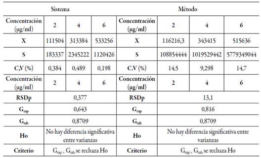 Como se indicó anteriormente, la repetibilidad (precisión intradía) fue evaluada a través del Test de Cochran (estadístico G); en la tabla 4 se observa que el G xp < G aab por lo que no hay diferencia significativa entre las varianzas de los niveles de concentración evaluados. De manera complementaria, los RSDp para la curva de calibración del sistema y del método son ≤ 5% y ≤ 15 %, respectivamente, cumpliendo con las especificaciones establecidas [14,15].