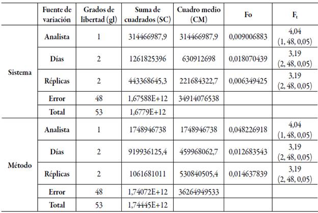 Tabla 5: Análisis de varianza (ANOVA) y estadístico de Fisher para determinar la precisión intermedia en las curvas de calibración del sistema y método.