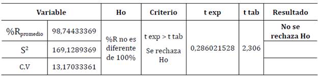 Adicionalmente, el análisis realizado con el estadístico t de Student (ver tabla 6) evidencia que el t estimado < t tabulado, lo cual conlleva a aceptar la Ho y concluir que el porcentaje de recuperación no es significativamente diferente de 100, por lo tanto, la metodología analítica es exacta para la cuantificación del ácido benzoico en la matriz biológica empleada.