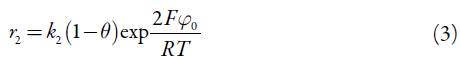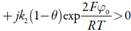 em que os parâmetros k são constantes das respectivas reações, F é o número de Faraday, φ 0 é o salto do potencial, relativo ao potencial de carga zero, R é a constante universal de gases, T, a temperatura absoluta e β o parâmetro, que descreve a interação entre as partículas do fosfazocomposto da acridina durante a sua dissolução e igal a 0, quando esta não ocorre.