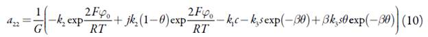 Analisando as equações (6), (10) e (14), que representam os elementos da diagonal principal, é possível mostrar que o comportamento oscilatório é possível neste sistema. De qualquer maneira, quando o parâmetro j, que descreve as influências da etapa ele-troquímica na capacitância da dupla camada elétrica, tem valores positivos, o adendo é positivo, descrevendo, destarte, a positiva conexão de retorno. Assim, ele descreve o comportamento oscilatório, causado por essas influências e característico para os sistemas semelhantes [22-24].