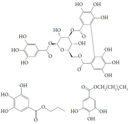 Figura 1: Os derivados importantes do ácido gálico. Galotanina, galato de propila (E310) e galato de octila (E311).