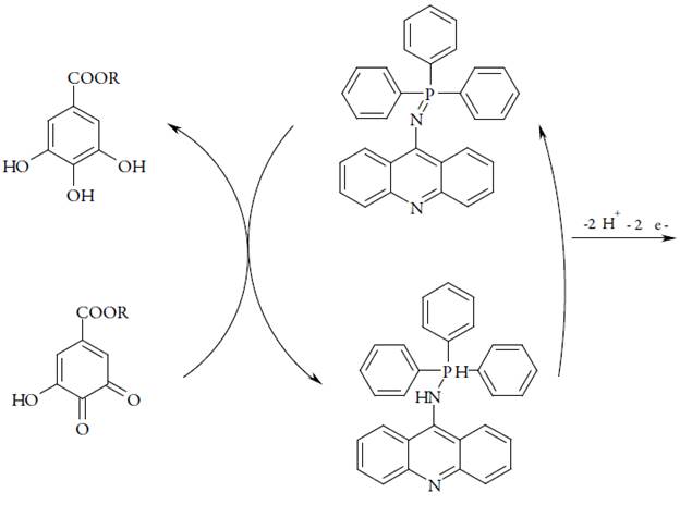 A presença do grupo trifenilfosfazoico, que consegue doar 20 elétrons pi ao sistema conjugado acridínico, diminui o seu potencial da eletrooxidação, fazendo possível, até a polimerização deste composto, ou a introdução do fragmento dentro de uma cadeia polimérica condutora. Destarte, o mecanismo do processo eletroanalítico para derivados do ácido gálico dar-se-á conforme a figura 3: