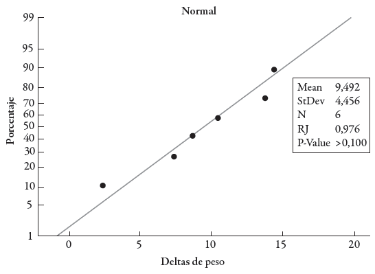 Se realizaron dos pruebas para comprobar la distribución normal y la homogeneidad de varianzas de la población. La distribución normal se evaluó mediante una prueba de Ryan-Joiner con un nivel de confianza del 95%, esto implicó contrastar siguientes hipótesis: H o : la población sigue una distribución normal, H 1 : la población no sigue una distribución normal.