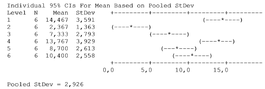 En la figura 6 están los intervalos de confianza a un nivel del 95% para la media, al menos, las medias procedentes de los tratamientos 2 (1,366); 3 (2,793) y 5 (2,613) son significativamente diferentes a las del control: