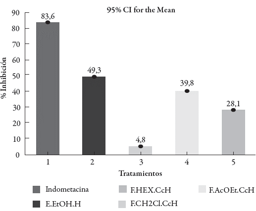 Los valores obtenidos para los tratamientos, el control y la indometacina se analizaron de forma gráfica (ver figura 7), lo cual corroboro los resultados del análisis estadístico, ya que los tratamientos que presentaron una acción antinflamatoria moderada fueron aquellos que tuvieron un porcentaje de inhibición de la inflamación entre 35-65%.