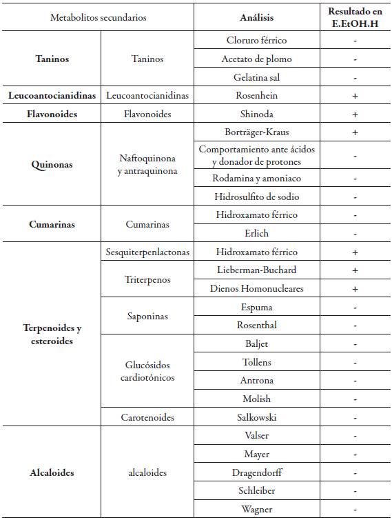 Los resultados de los ensayos químicos preliminares realizados al extracto etanólico de hojas (E.EtOH.H) de la especie Cavendishia compacta se encuentran en la tabla 1.