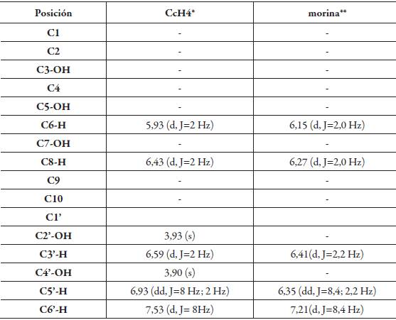 Tabla 2: Comparación de los desplazamientos químicos RMN 1H del compuesto CcH4 con el de morina.