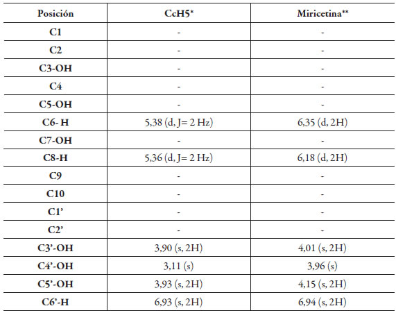 El compuesto CcH5 obtenido como un sólido de color verde (160 mg) fue analizado a través de espectrometría de masas por inserción directa. En el espectro de masas se muestra el ion molecular a m/z 318 y señales en m/z 317 (M-H), 302, el pico base en m/z 179 (M-138), 136 y 138 el cual corresponde al flavonol Miricetina [8]. El espectro de RMN 1H del compuesto CcH5, muestra tres singletes en δ 3,90; 3,11 y 3,93 ppm correspondientes a grupos hidroxilos ubicados en las posiciones C-3', C-4' y C-5' [9], dos dobletes en δ 5,36 ppm (2 Hz, 1H) y 5,38 ppm (2 Hz, 1H) correspondientes a protones unidos en las posiciones C-8 y C-6 respectivamente, finalmente un singlete en δ 6,93 ppm que corresponde a dos protones unidos al C-2' C-6' [10].