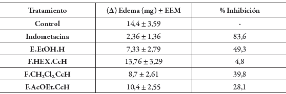 De otro lado, la tabla 4 muestra los resultados del efecto del extracto y las fracciones evaluadas sobre el edema producido por la aplicación del TPA, encontrándose, que el extracto E.EtOH.H y la fracción F.CH2Cl2.CcH exhibieron una actividad antiinflamatoria moderada respecto al control con un porcentaje de inhibición del edema de 49,3% y 39,8%, respectivamente, mientras que la indometacina mostró una inhibición del edema de 83,6% a la misma dosis, con lo que se confirma la validez del ensayo y los resultados mostrados por el extracto y las fracciones evaluadas. Las fracciones F.HEX. CcH y F.AcOEt.CcH presentan un efecto antiinflamatorio nulo ya que sus porcentajes de inhibición fueron del 4,8% y 28,1% respectivamente.