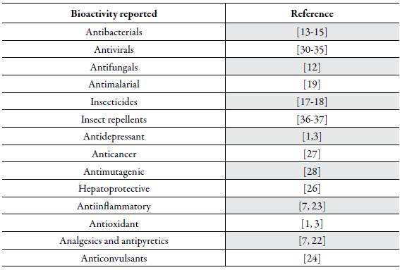Many studies carried out with essential oils have reported that they have a broad microbiological activity such as: antifungal [12], antibacterial [13-15], acaricide [16], insecticide [17,18], antimalarial [19], quorum sensing [20], and antiviral [21]. They also have properties such as: analgesics [7], antipyretics [22], anti-inflammatories [7,23], anticonvulsants [24], as an estrogenic agent [25], hepatoprotective [26], anticancer [27] and antimutagenic [28]. They are also used in the treatment of gastric ulcer and different types of cancer [3].
