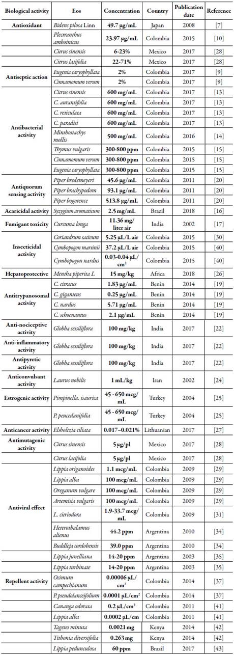 Nature gives us a large number of compounds with interesting biological properties, within them we have essential oils, which are an important source of new bioactive molecules, which can replace synthetic chemicals, since they are friendly to the environment and they are less toxic. Currently there are more than 20.000 publications in which essential oils are related to some biological activity, according to the search made in different databases until January 2018. This confirms the wide utility of essential oils as the main source of bioactive metabolites, which can be used in different areas of our life.