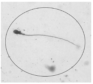 En la figura 2 observamos un espermatozoide de ratón y en la figura 3 observamos un espermatozoide humano, comparando ambas figuras podemos apreciar que la morfología de los espermatozoides de los ratones no difiere de la de los seres humanos, salvo en el tamaño que según la bibliografía en los ratones es de 8 micras y en el ser humano de 45 micras, esta diferencia de tamaño hace que en el espermatozoide humano se pueda apreciar y diferenciar con mucha claridad las partes de un espermatozoide (cabeza, cuello y cola).