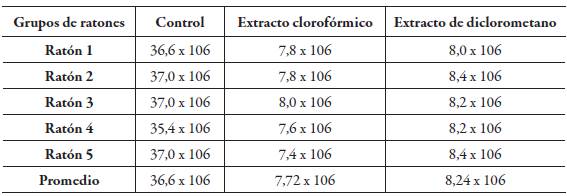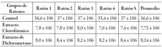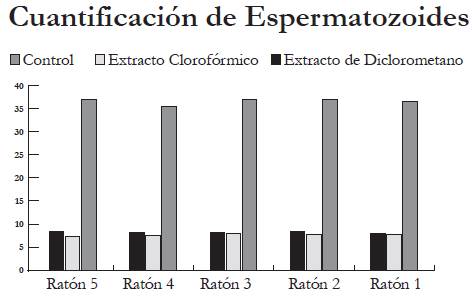 La mayor disminución de espermatozoides fue la del grupo tratado con el extracto seco clorofórmico en el que se observa una disminución del 79,9%, en cambio, el grupo tratado con el extracto seco de diclorometano presentó una disminución del 71,1% (respecto al grupo de control).