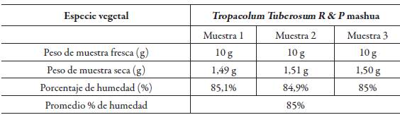 Tabla 1: Resultados del porcentaje de humedad de la especie vegetal Tropaeolum Tuberosum R & P mashua.
