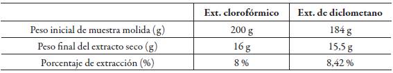 Tabla 2: Resultados del porcentaje de rendimiento de la extracción de con los solventes de cloroformo y diclorometano de especie vegetal mashua.