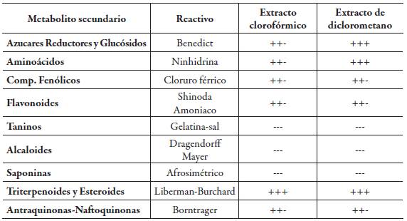 Nota lectura de metabolitos secundarios: + + + : abundante cantidad + + -: moderada cantidad +--: escasa cantidad ---: ausencia.