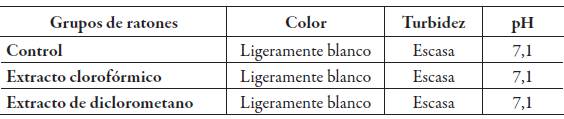 En el examen macroscópico, realizado en el homogeneizado de las colas de los epidídimos para cada grupo de experimentación, podemos apreciar que no existe mayor diferencia entre los grupos experimentales y el grupo control, este hecho podría deberse a que se trabajó con los homogenizados, los cuales fueron preparados en 0,5 mL de solución fisiológica, esta tiene un pH de 7, por lo tanto al añadir las colas de los epidídimos y homogeneizarlas el pH de la solución fisiológica no se altera de manera significativa.