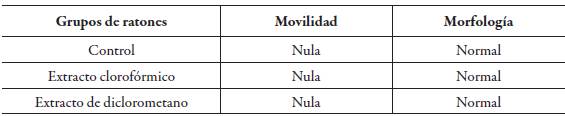 Tabla 7: Examen microscópico de los espermatozoides de los ratones mostrados en los grupos de control, extracto clorofórmico y extracto de diclorometano de la especie vegetal mashua.