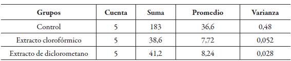Tabla 10: Análisis de estadísticas básicas de los grupos de ratones: control, extracto clorofórmico y extracto de diclorometano de la especie vegetal mashua.