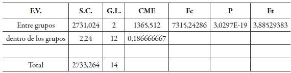 Como p = 0,000000 < 0,01 (1%), entonces se rechaza la hipótesis nula (Ho), y aceptamos la hipótesis alterna lo que podemos decir que existe una diferencia altamente significativa entre los dos tipos de extractos y el grupo control aplicados a los ratones.